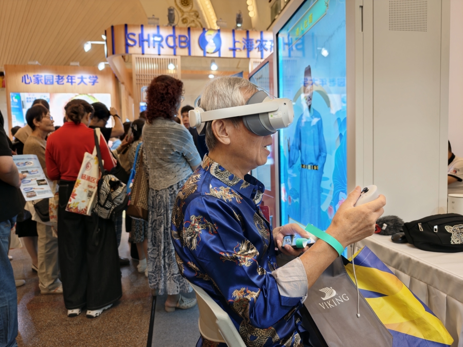 图为老人在“新兴科技体验区”感受VR沉浸式体验装置