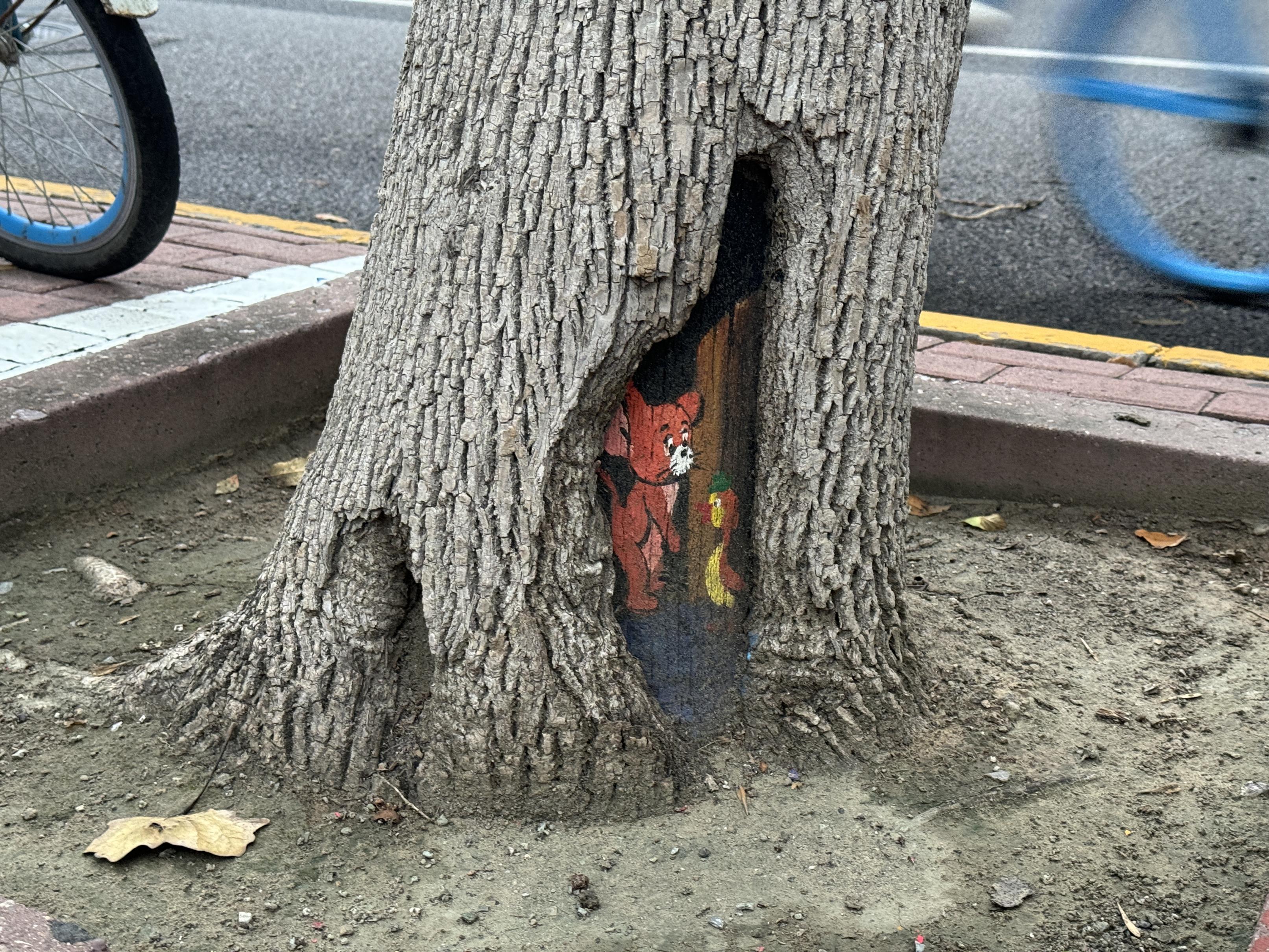 不少市民关心:“树洞画”是否会影响树木生长?对此,记者了解到,彩绘全部采用环保颜料,不会影响树木生长。一个个鲜活角色“长”在树上,既美化了树木的岁月痕迹,也与周围环境相映成趣。