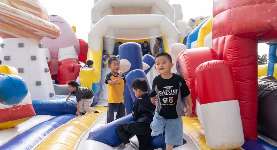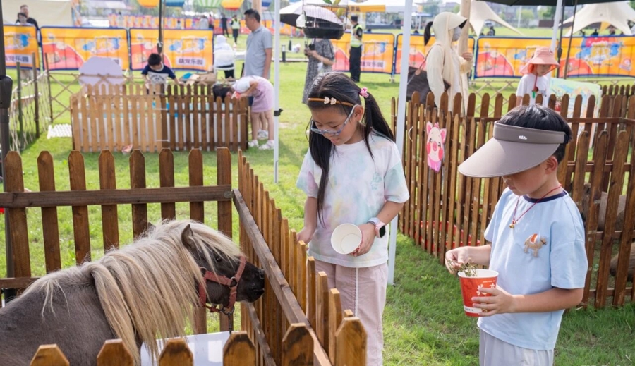 园内西侧的大草坪上,萌宠体验区成为人气焦点,羊驼、小香猪、小兔子、矮马等齐聚一堂,首次现身崇明的水豚“卡皮巴拉”最受欢迎,孩子们兴奋地投喂互动,现场欢声笑语不断。一旁的热气球下午茶区也成打卡热点,色彩斑斓的热气球悬停于草坪上,游客可以在吊篮里边品尝茶点,边欣赏美景。40多个特色摊位汇聚了文创手作、本地特产与风味餐饮,游乐互动区则打造了粉红沙滩、网红挖土机、小火车、空气城堡等10余项亲子项目,让家长们的带娃之旅轻松又尽兴。